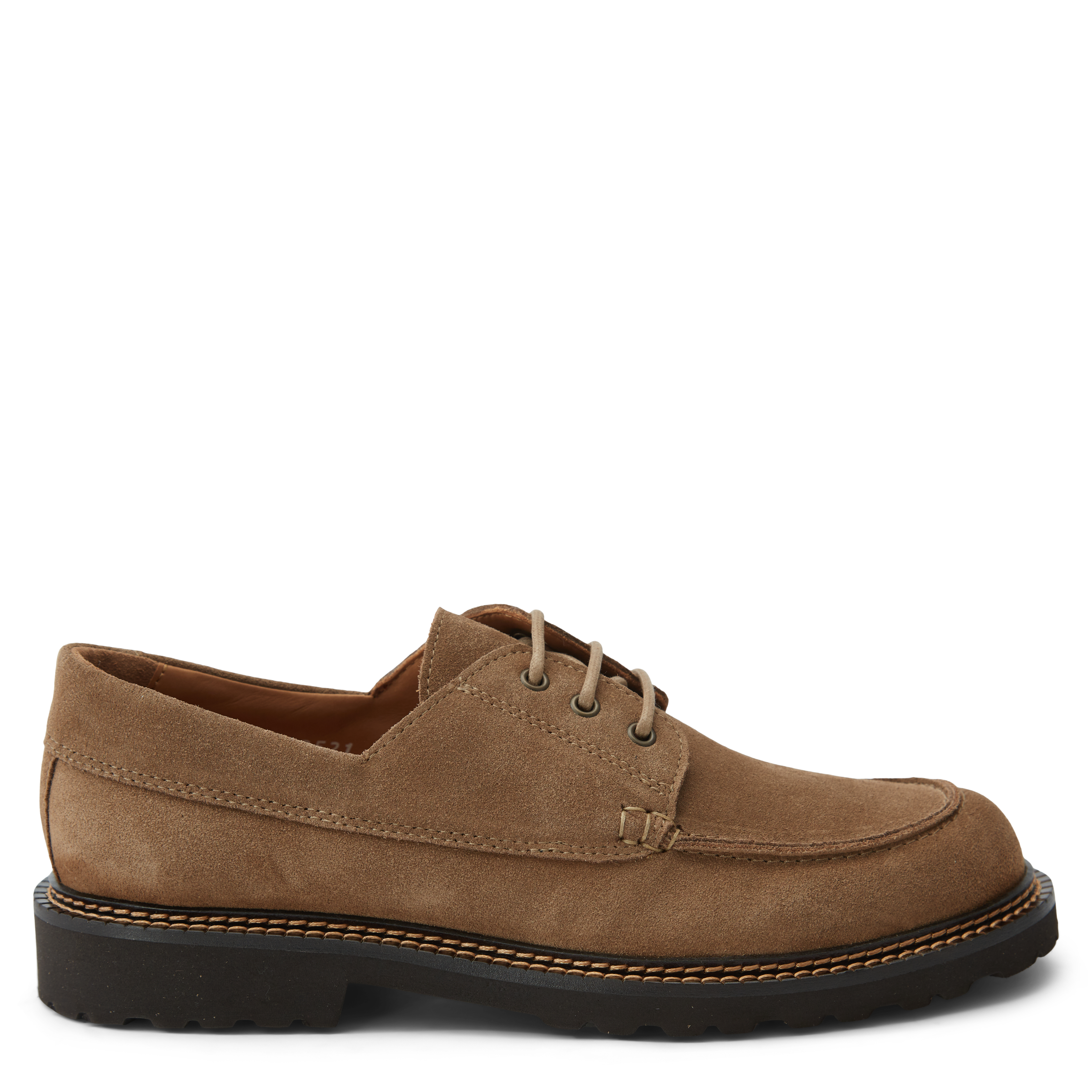 Boat shoe fremstillet med overdel i ruskind. Linning og indersål udført i kalve læder, samt kontrastfarvet stikninger.
