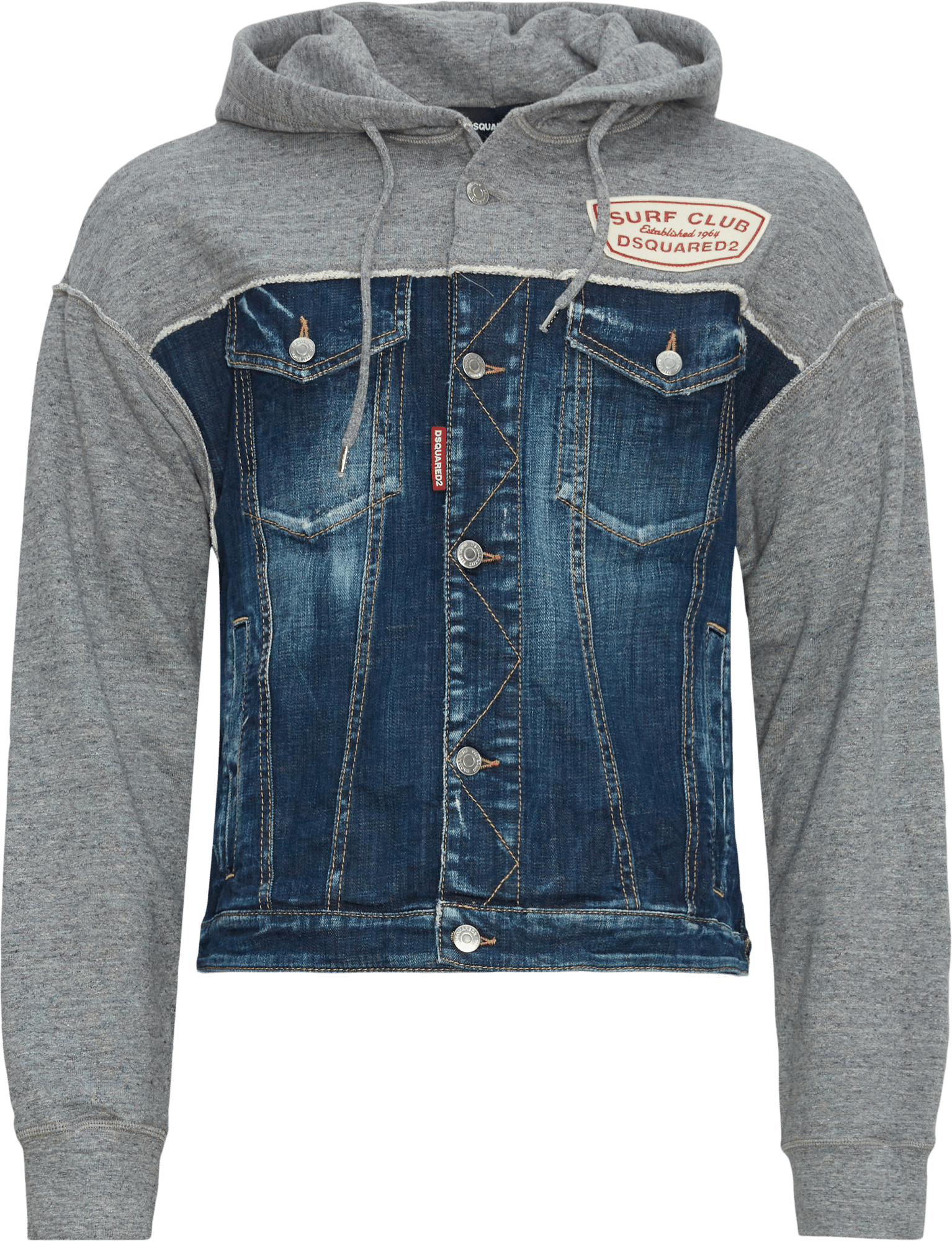 Denim overshirt fremstillet i bomuld med hætte. To brystlommer, logo applikation, samt to stiklommer.