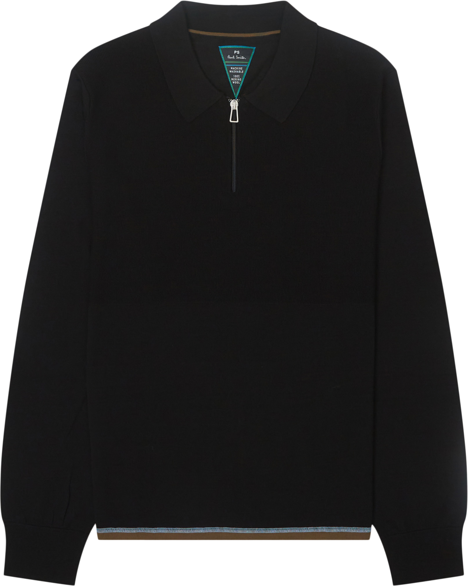 Half-zip polo strik fremstillet i 100% merino uld, med klassisk flip. Ribkant ved ærmer, samt kontrastfarvet kant ved bund.